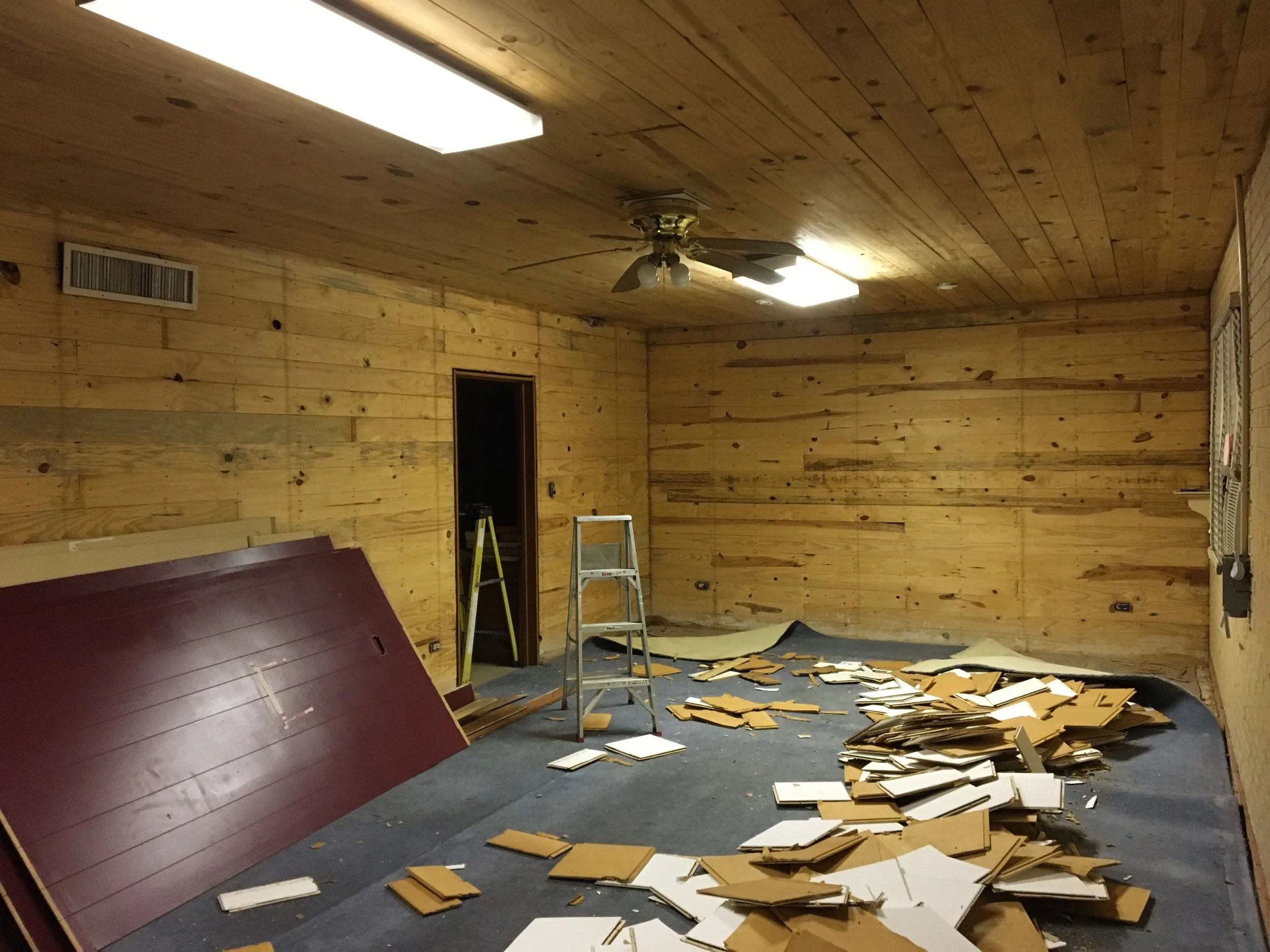 In the first phase of renovation, the chapel’s ceiling tiles, wall paneling, and carpet were removed. The exposed hardwood ceiling was simply sealed with polyurethane to highlight its natural colors and textures. Both the hardwood and brick walls were painted. The original terrazzo floors were cleaned and resealed.